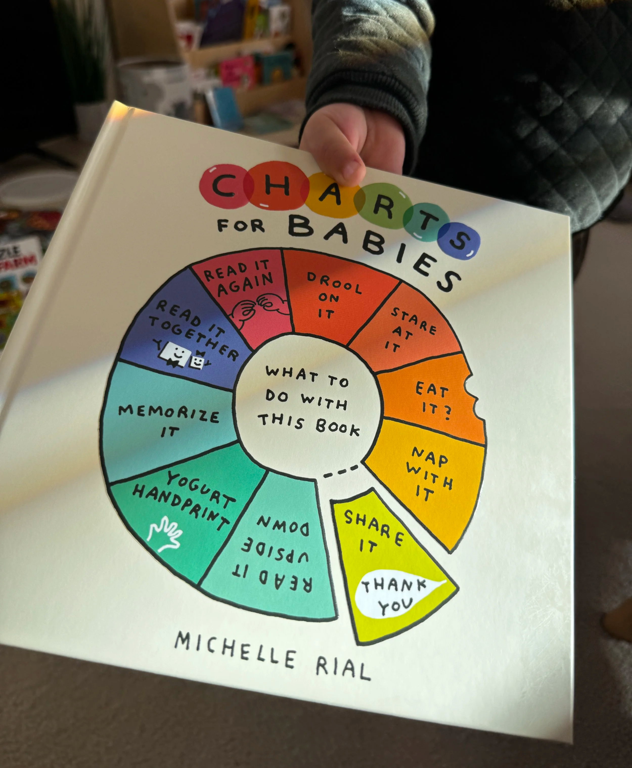 When Michelle set out to create a book for new parents in the style of her other adult books, children’s book rhyme cadence was stuck on repeat in the back of her mind (thanks to reading 100,000 books per day with her baby). She flipped to the back of her notebook and began sketching simple charts about opposites, shapes, colors, and other early childhood concepts that lend themselves to chart form. She filled the notebook all the way to the front, and Charts for Babies was born.